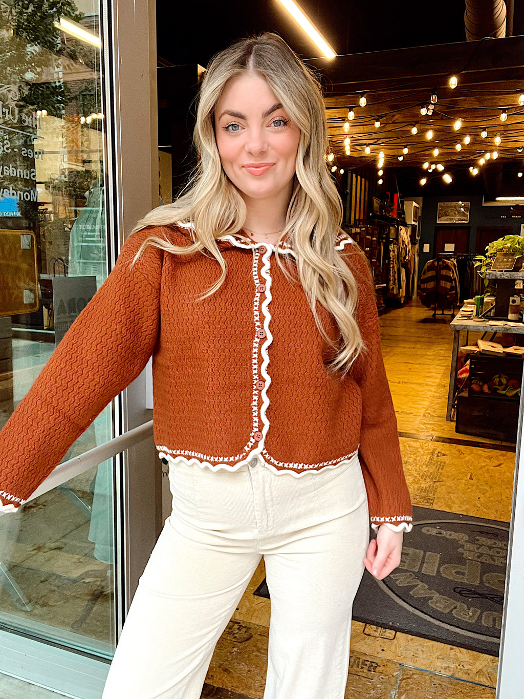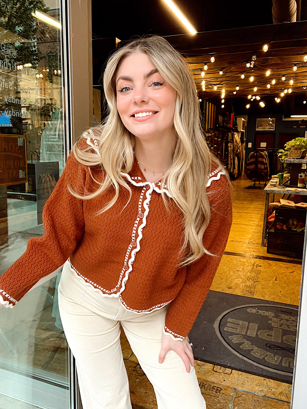 Clay brown colored, cropped button up sweater. Features a wavy pattern and a sailors collar. Finished with white criss-cross stitching along the white scalloped edges and five Suttle brown buttons.