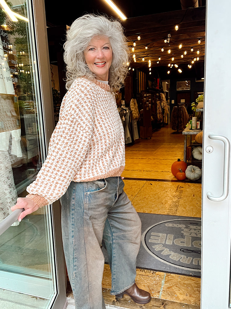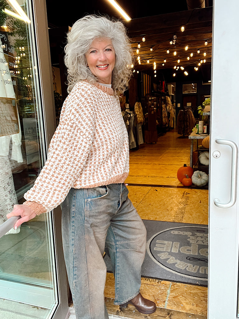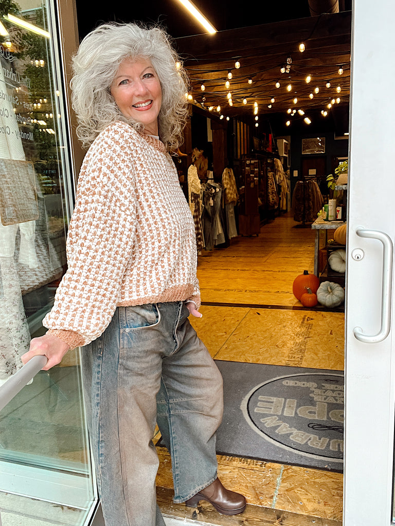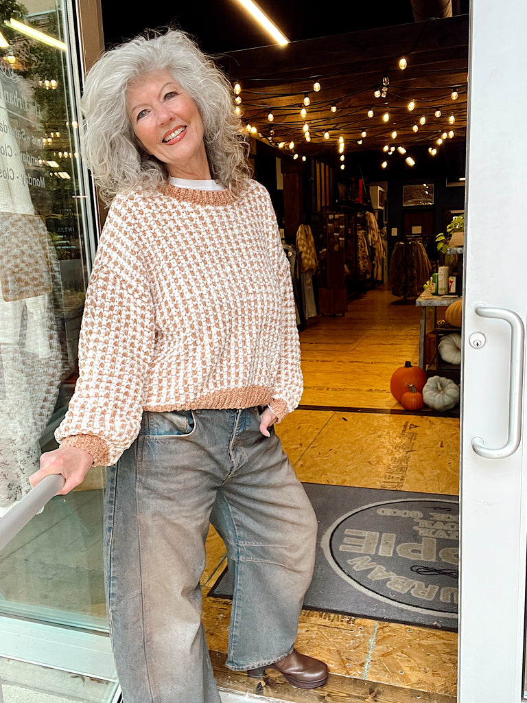 Carmel and Cream Cheneille Knit cropped sweater. Features crew neck with solid carmel detailing on neck and sleeve cuffs.