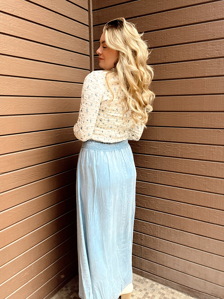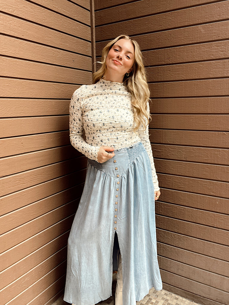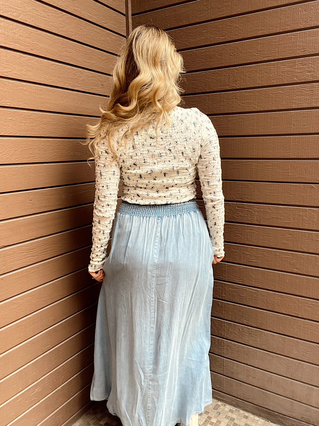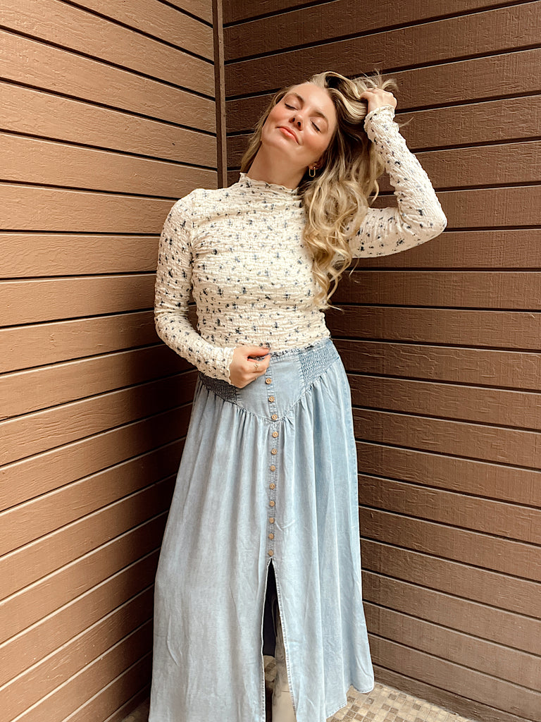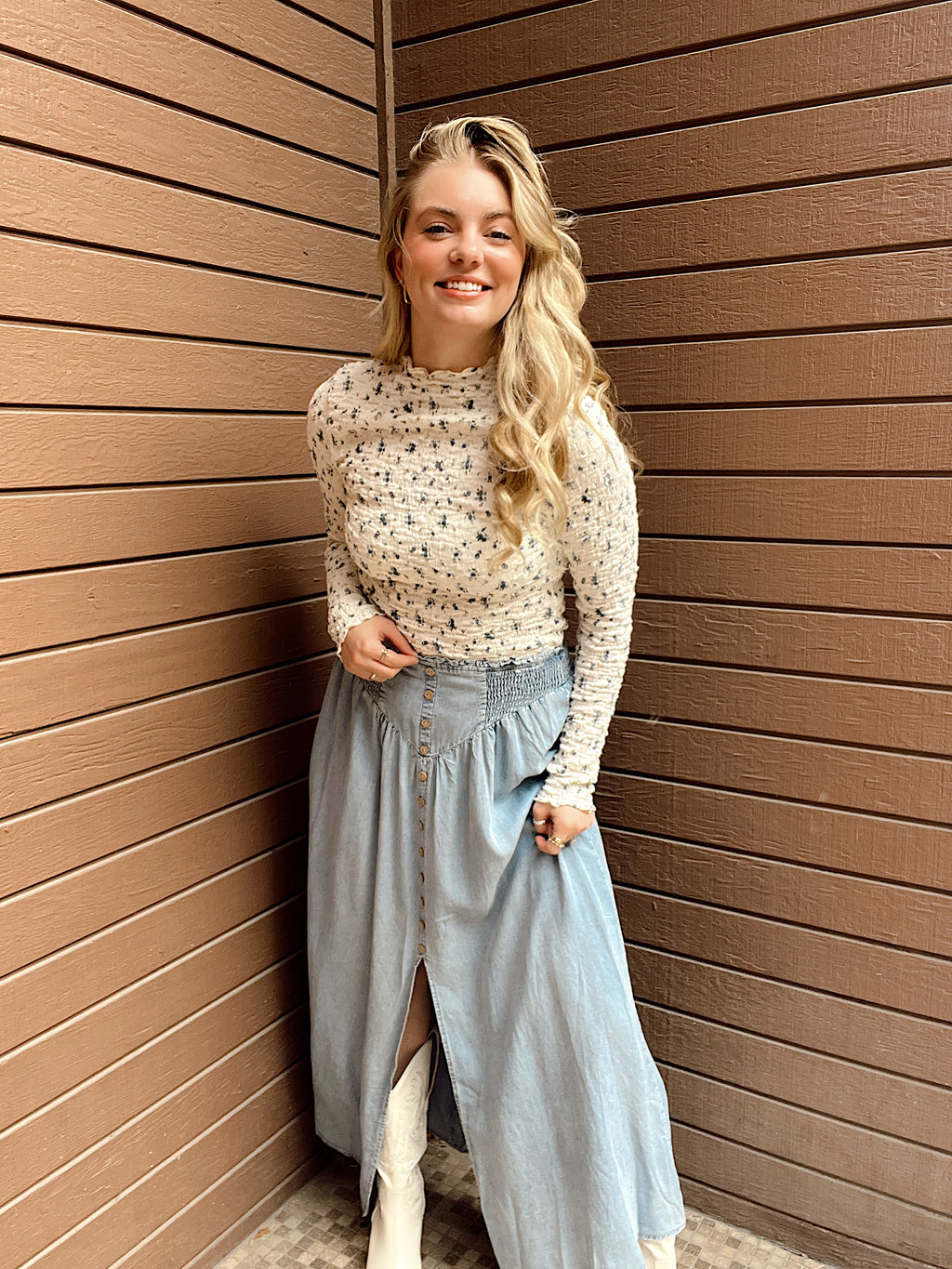 Cream colored body stretch knit long sleeve top. Features dark blue small flowers throughout top with boat neck line. Stretch material.