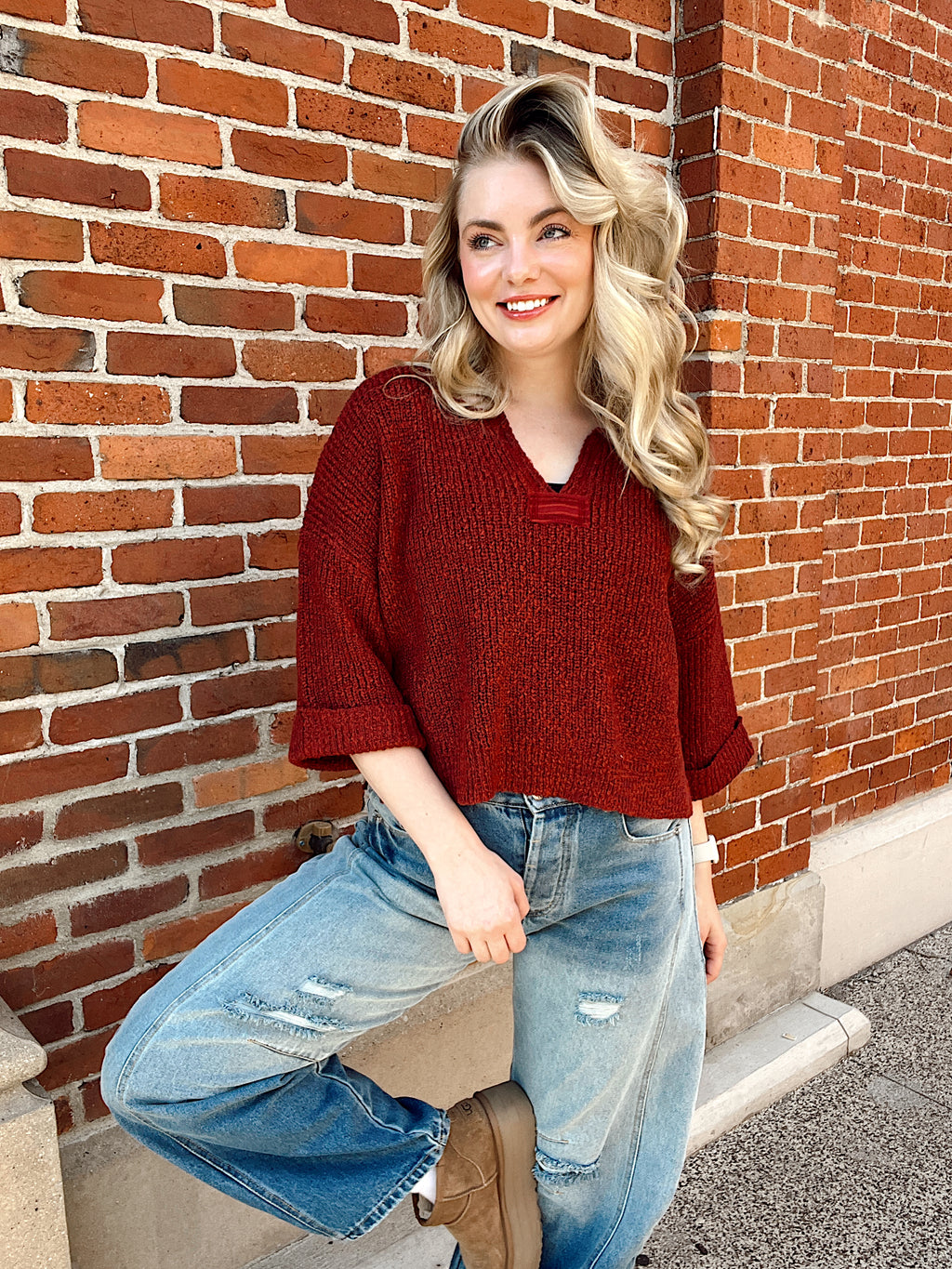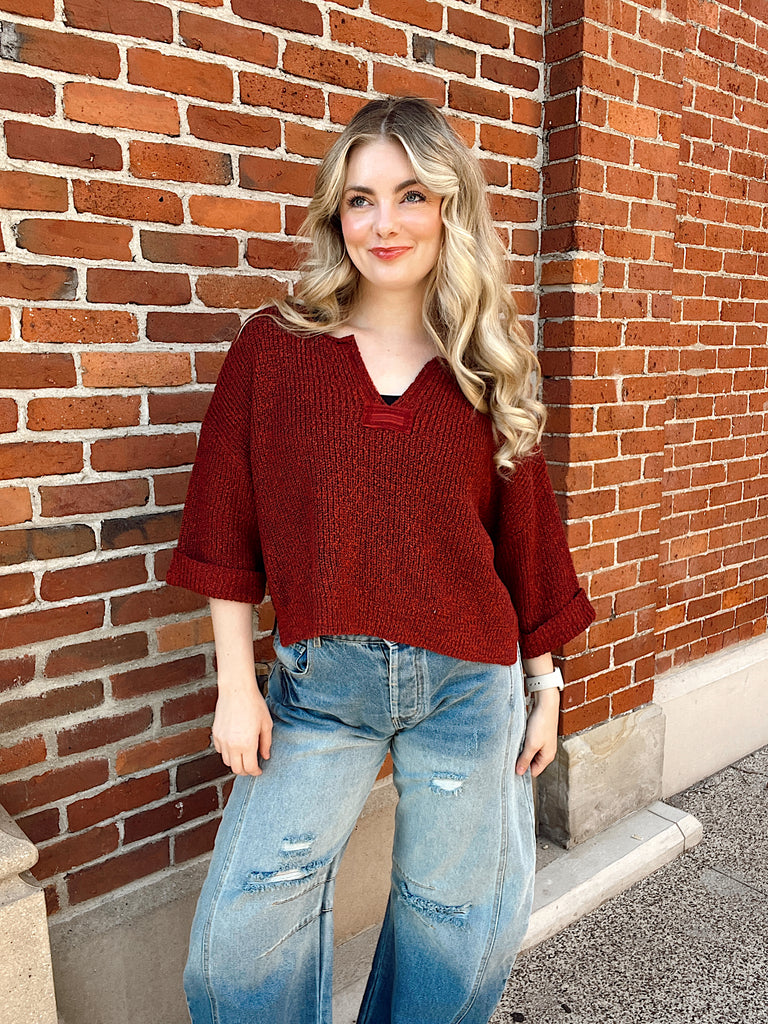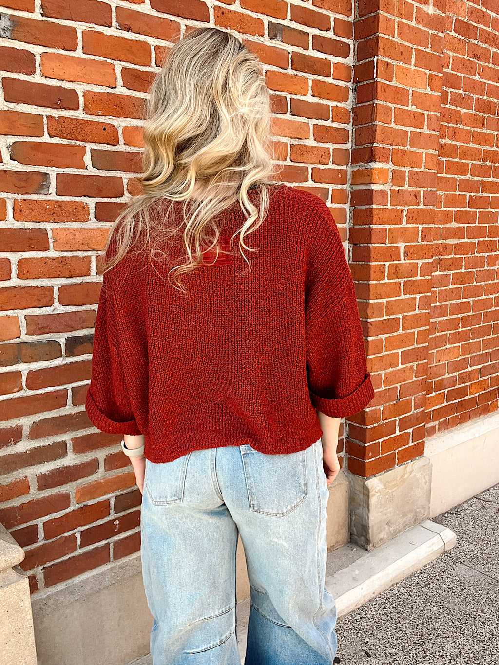 Rust colored sweater. Features a split neck detailing, rolled sleeves and thick knit material. Finished with a cropped but boxy fit.