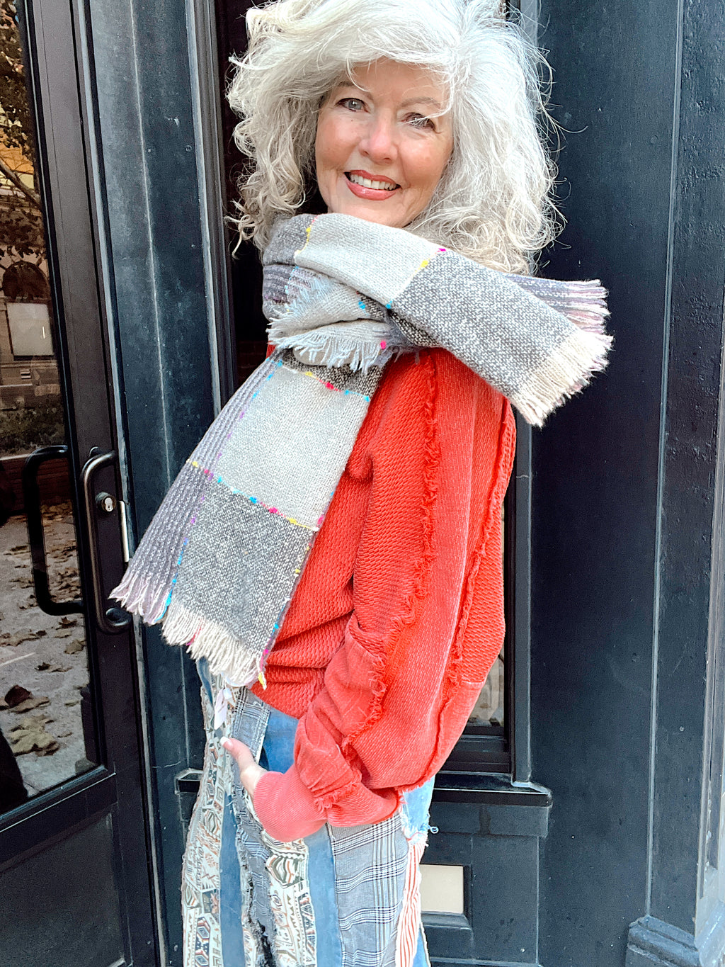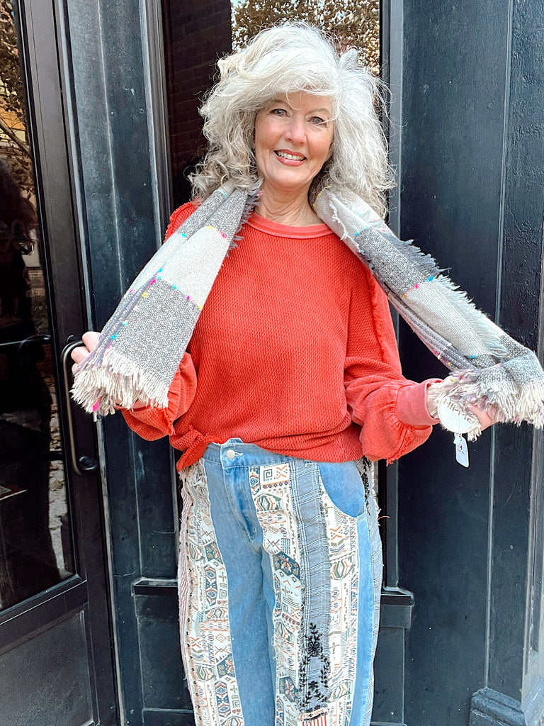 Faded Rosy Red Thermal Knit Top. Features crew neck with frayed seams on sleeves, long fit. Waffle knit material.
